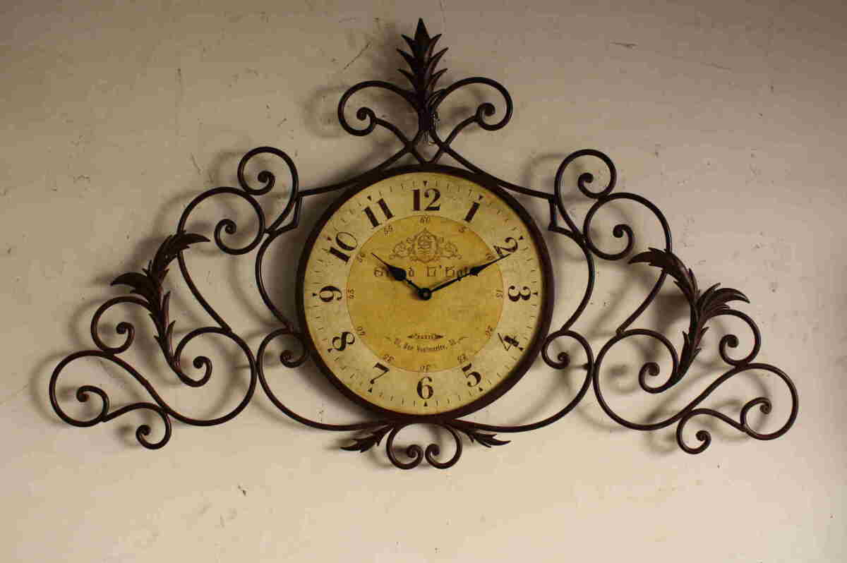 Riproduzione fedele di antico orologio ,1889, del "Grand Hotel de Paris", Francia. Struttura in ferro battuto a manocon trattamento di antichizazzione. Dimensioni 105 x 60 cm.